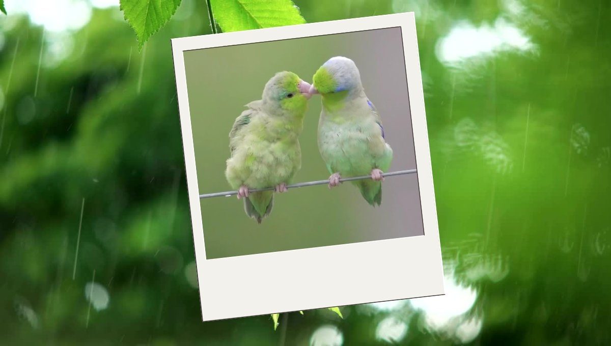 En la tranquila lluvia, uno de los loros voltea con su pareja para acicalarla con mucho cariño, sensación placentera para la otra ave que coloca su cabeza en la posición correcta para ser acariciada con el pico de su compañero. La muestra tan hermosa de cariño propicia que las aves, con la alegría de su compañía y cobijados por un clima con lluvia, se den un tierno beso que dura apenas unos segundos, pero deja ver el gran amor que habita entre las especies.
